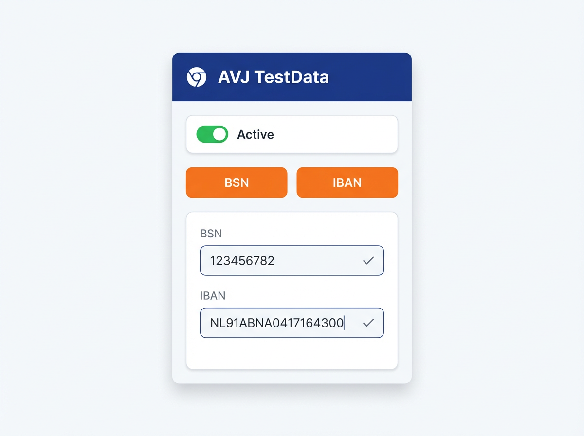 Chrome extensie die automatisch geldige BSN, IBAN en meer genereert en invult in formuliervelden. Met Uitgebreide Modus voor naam, adres, telefoon, e-mail en meer — met herkenbare fictieve testdata.